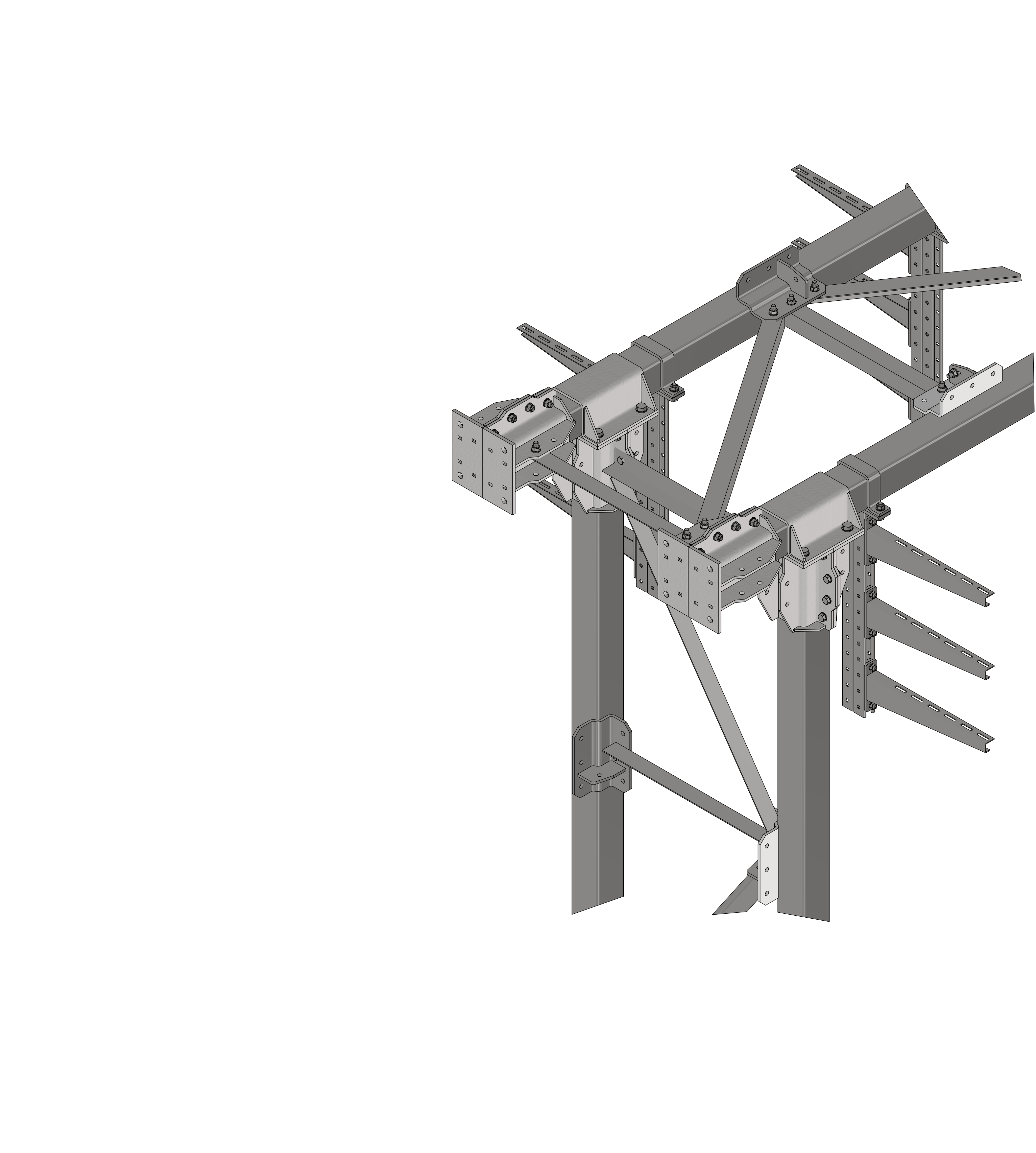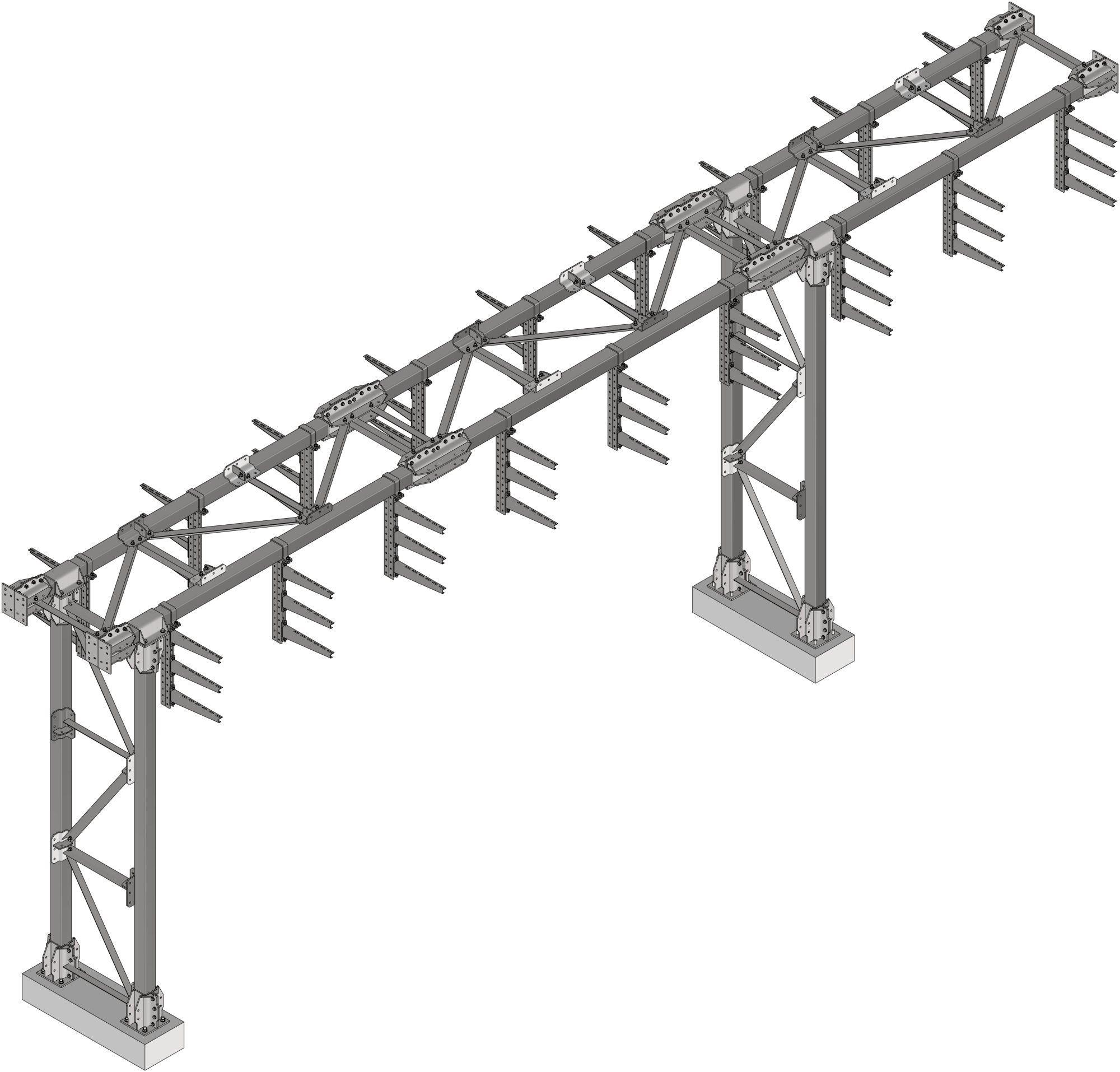 Конструкция состоит из двух вертикальных стоек, соединенных ригелем и диагональными раскосами, что обеспечивает высокую устойчивость к ветровым и механическим воздействиям в сложных климатических условиях низких температур. Модульная система сборки без сварки делает эстакаду удобной для быстрой установки на объекте.